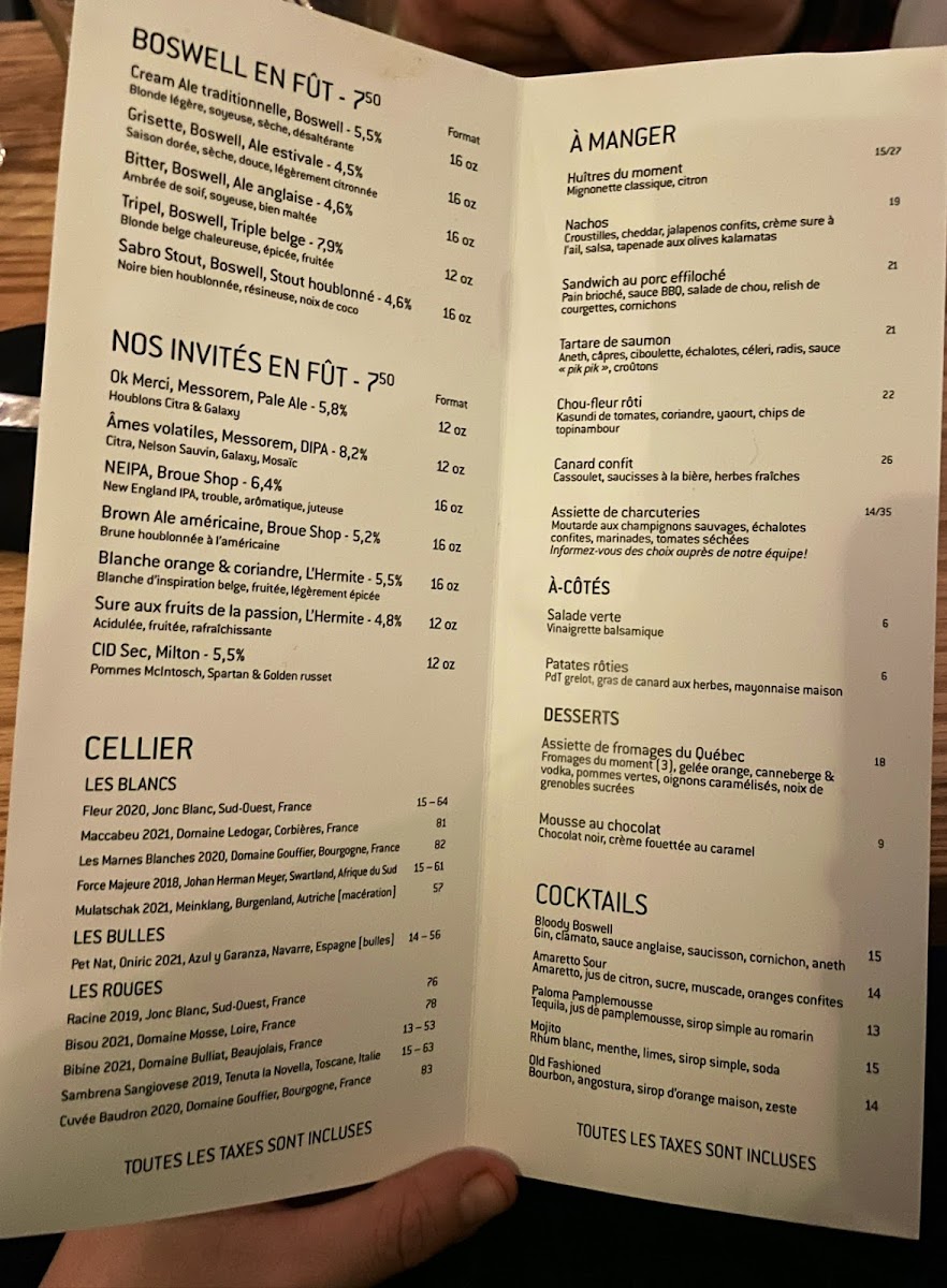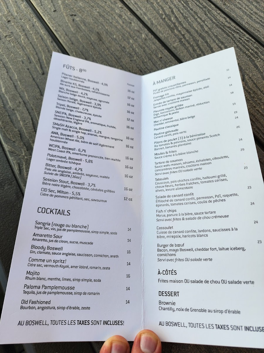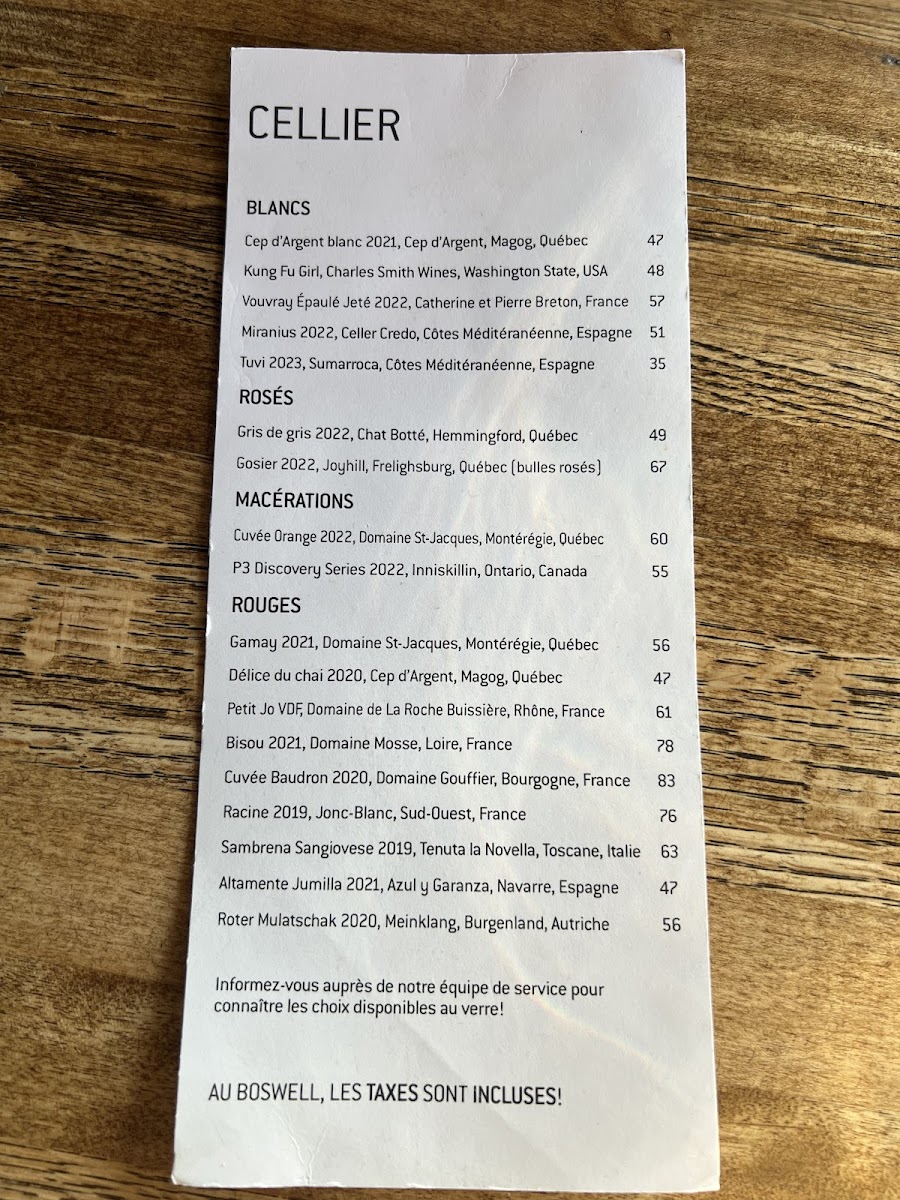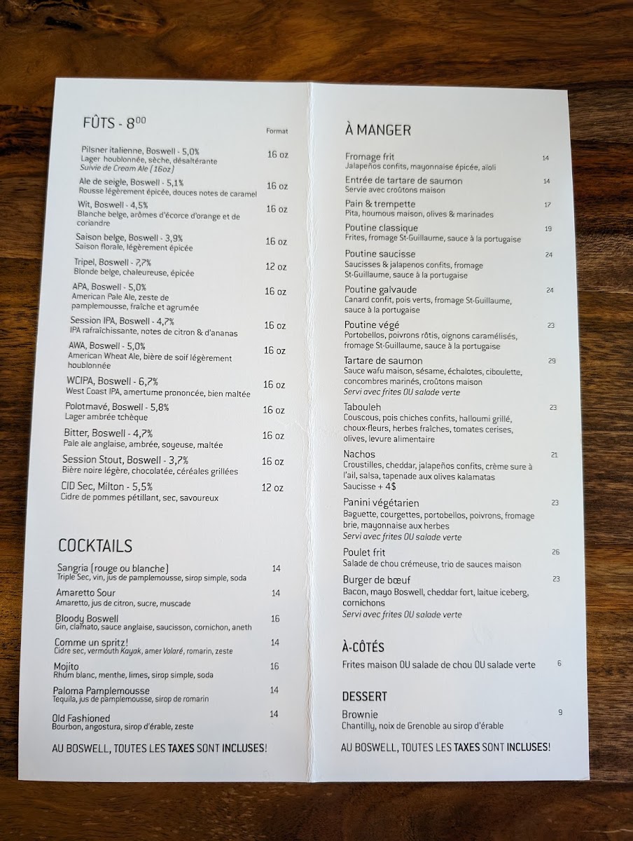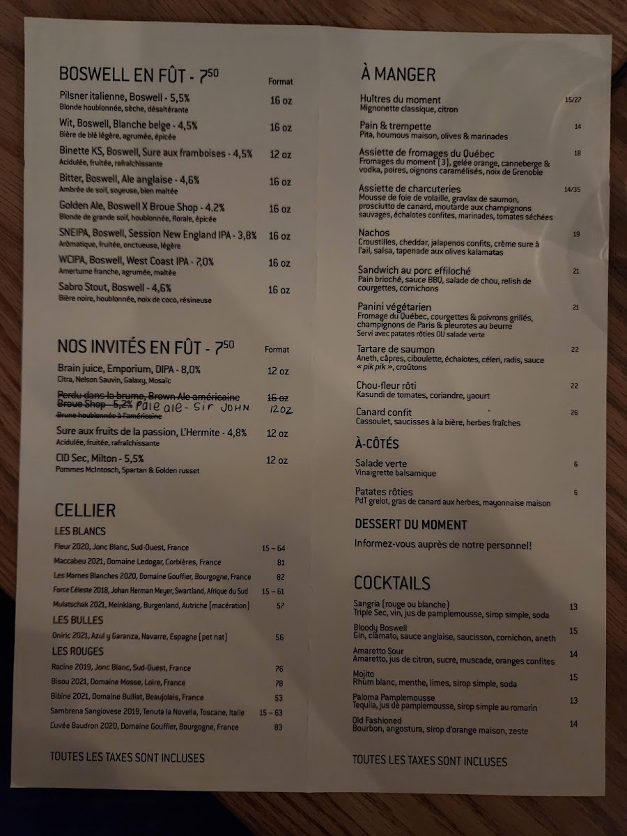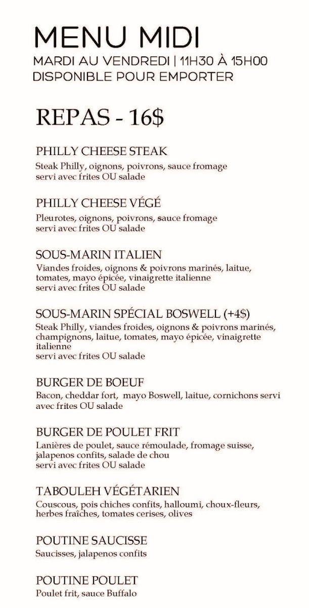 Boswell Brasserie & Boutique offers a delightful selection of dishes that showcase both comfort and creativity. For starters, the Huîtres (oysters) provide a fresh and briny introduction to the meal, setting the tone for the rest of the menu. For something a little more indulgent, the Pain & Trempette is a warm, savory dip that's perfect for sharing, while the Poutine Galvaude presents a comforting twist on the classic, with tender chicken and rich gravy topping golden fries. The menu also features an enticing combination of craft beverages with the Bières Et Charcuterie, a perfect pairing of local beers and a selection of charcuterie that satisfies both the beer enthusiast and the lover of artisanal snacks. Whether you're here for a light bite or a hearty meal, Boswell's menu delivers both quality and variety in a welcoming setting.